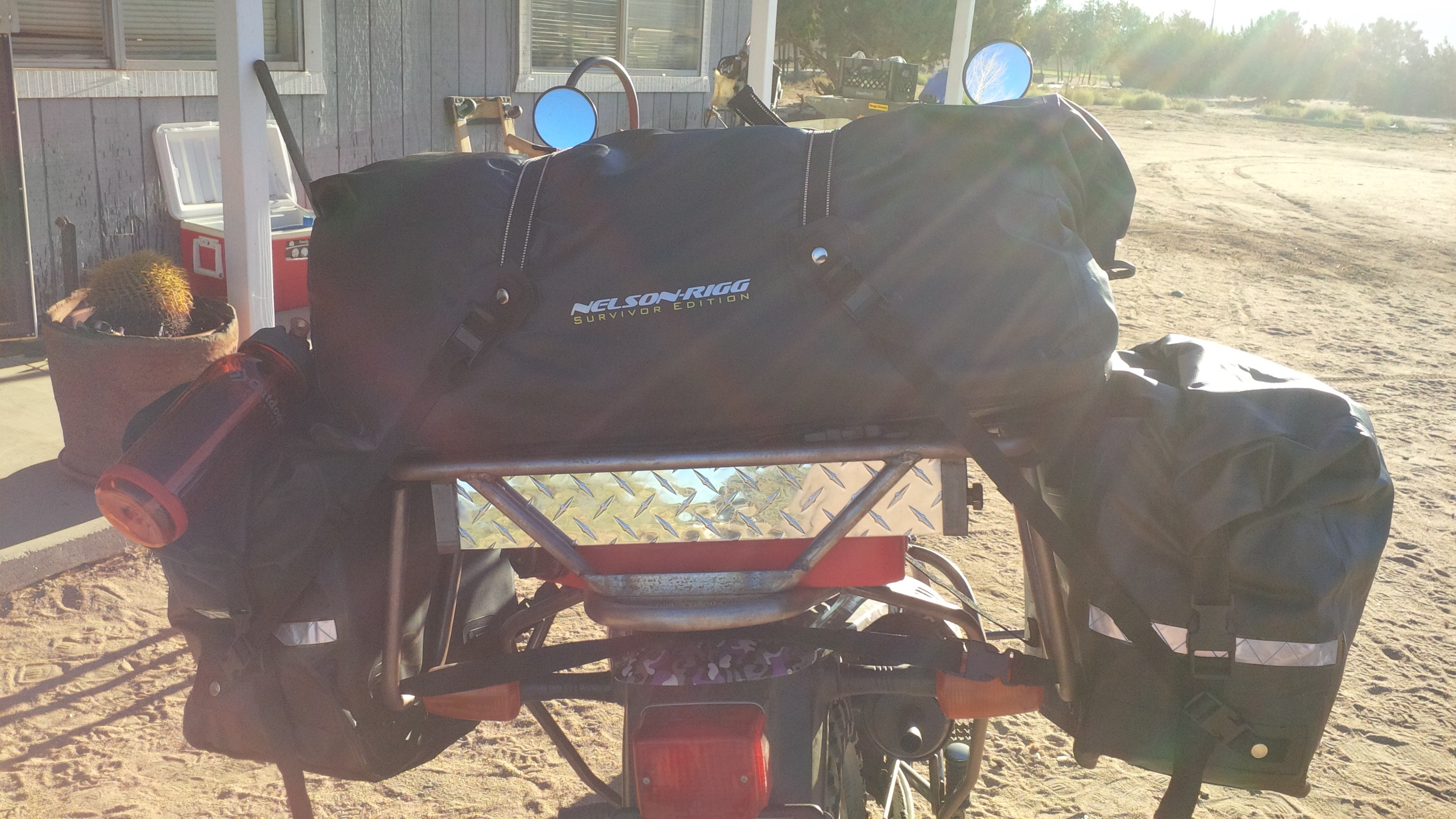 So I decided to purchase the Nelson-Rigg USA Adventure Dry Bag and saddlebag Survivor Edition for a couple of reason. One is the price; the total combined cost me around $250.00 for both. Secondly, it designed like a dry sack bag used in backpacking. This way I didn’t have to put everything in a dry sack bag before putting it in a luggage. Thirdly, the saddle bag is a soft pack. I was worried about getting a hard case panniers system in case I drop the bike and it would crush my legs.