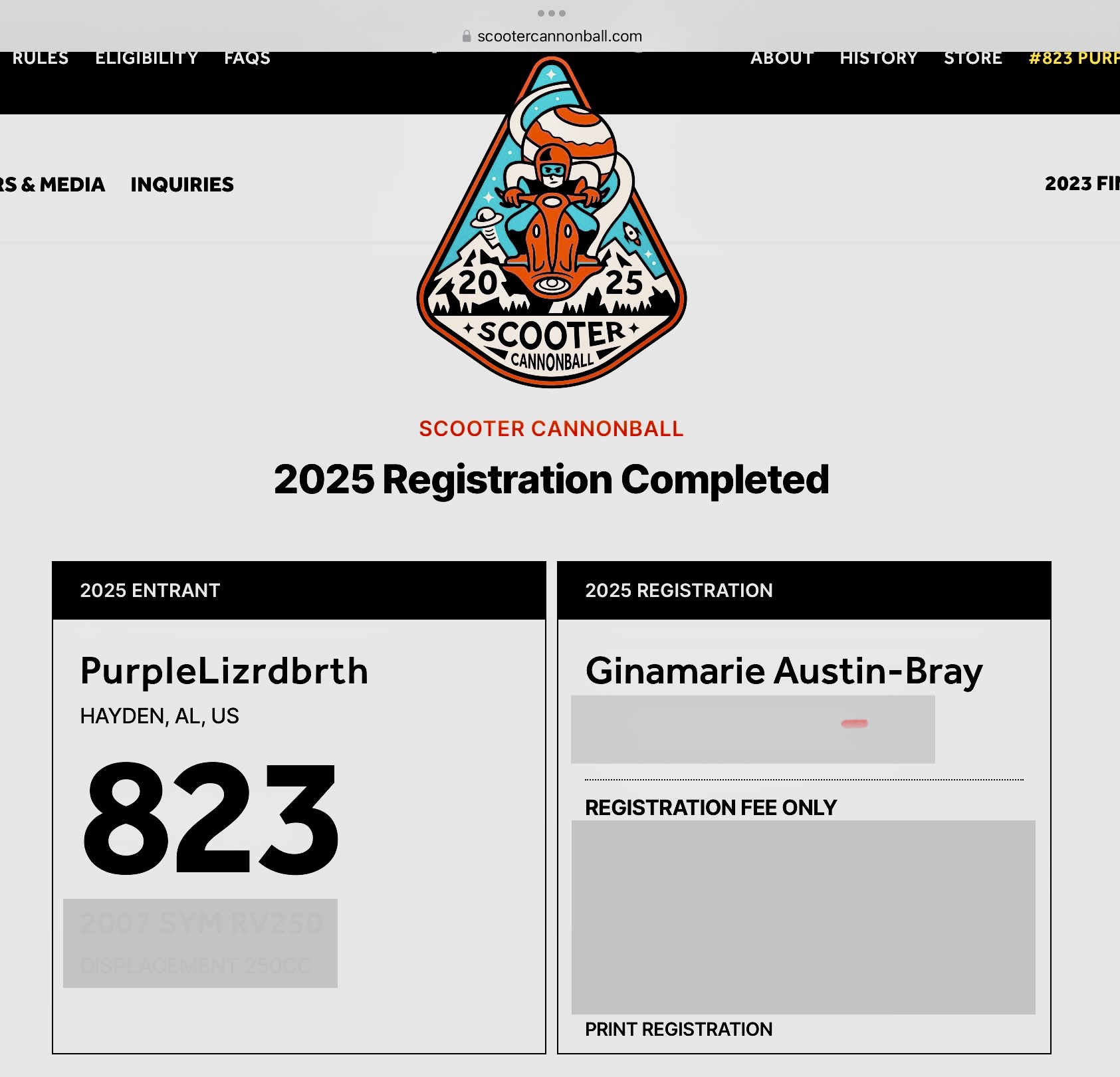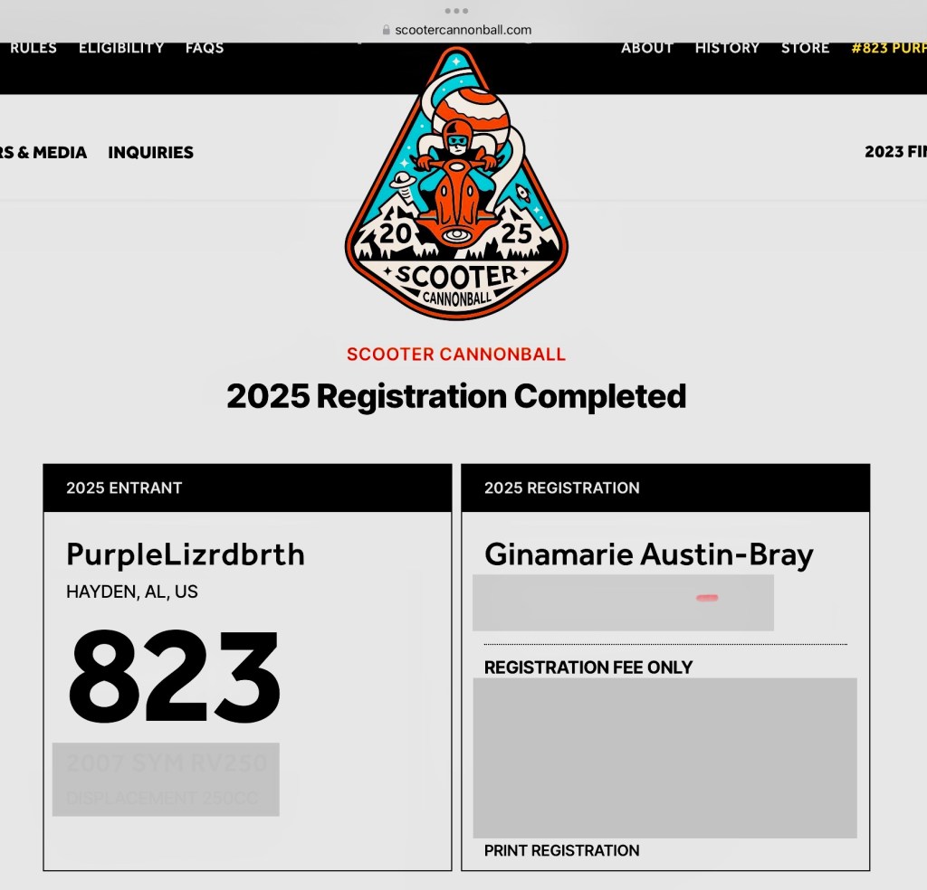 Look at that: now the Continue button is enabled, click! Here we go. I have officially registered for the 2025 Scooter Cannonball Run. Am I crazy or what?!?!