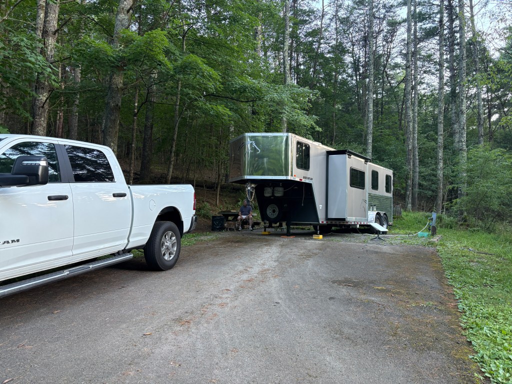 We finally pulled into Stony Fork Campground around 4 PM, with plenty of daylight left. The next challenge? Learning to communicate while backing our massive trailer into a campsite on an uphill slope with a narrow, ninety-degree turn. After multiple failed attempts, we were both so frustrated. We even considered moving to a first-come, first-serve site, knowing we might have to pay for two. We managed to back into the site next to our original one, but then discovered the electrical hookup was too far away. Back to square one! Just as we were about to implode, another camper came to our rescue, helping Mark navigate the front of the truck while I handled the back of the trailer. Whew, we did it!