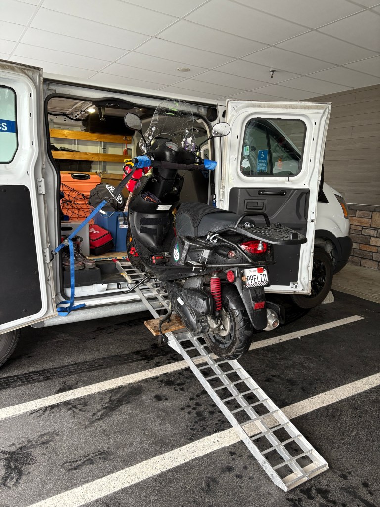 I reached out to GoPam, who knew of a rider with a tire-changing kit. A few messages later, the bad news came: he hadn’t brought it this year. But GoPam told me not to despair. A fellow rider, The Governor, who owns a scooter shop in Maine, stepped in to help. He didn’t have a tire changer, but he had the tools and the ingenuity to jerry-rig a solution. We hoisted LP onto a van ramp, using a tie-down strap to keep her in place. With the exhaust pipe off, we were able to get to the rear tire. In no time, we had the old one off and the new one mounted.