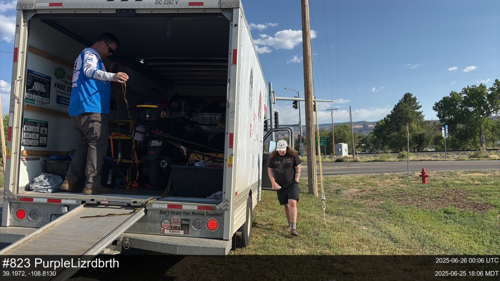 The light turned green, and LP stalled. She wouldn’t turn over. Crap. I was blocking traffic, with nowhere safe to pull over. Frantic, looking for a spot to push her, a support truck from Team Scooter Iceland pulled up behind me. The gentlemen, not mechanics, tried to troubleshoot but then offered to load LP into their U-Haul. They didn’t want me waiting by the road alone for the official support truck, which was over an hour away. I told them I was a big girl and could wait, but they wouldn’t hear of it. Plus, they said, one of their riders, #444, was a mechanic. He could help. We loaded LP, and I had to show them how to tie her down. These guys were friends of the rider, volunteering as support for a great cause: raising awareness and money for Pulmonary Fibrosis.
